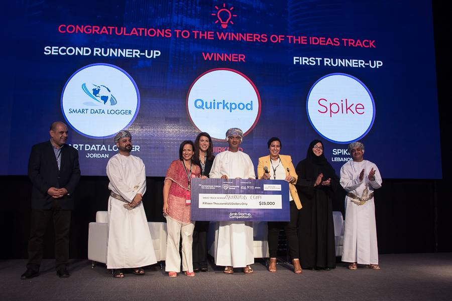 وجاء توزيع جوائز الفرق الفائزة في فعاليات المسابقة العربية الأولى من نوعها في ريادة الأعمال على النحو التالي: في مسار الأفكار - جاءت شركة "كويرك بود" من مصر في المركز الأول، وهي منصة على شبكة الإنترنت تطور مهارات الطلاب من خلال محتوى أعدّه خبراء، بتصميم شيق وجذاب يشجع الطلاب على التفاعل، وفي المركز الثاني جاءت شركة "سبايك" من لبنان - وهي تساعد مرضى السكري على إدارة إستهلاك الإنسولين من خلال ابتكارات في مجال الأجهزة والبرمجيات، وفي المركز الثالثSMART DATA LOGGER من الأردن – وهي تقدم جهاز لمراقبة درجات الحرارة التي تتعرض لها الشحنة.