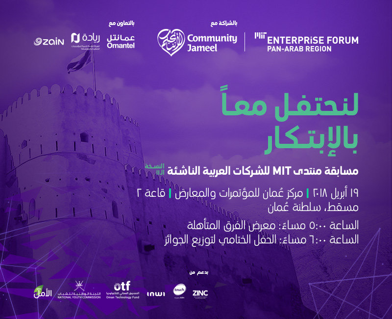 عُمان- الكويت- لبنان - أعلن منتدى MIT لريادة الأعمال في العالم العربي عن استضافته للحفل الختامي لتتويج الفائزين في مسابقة منتدى MIT للشركات العربية الناشئة في نسختها الـ 11، وذلك في 19 نيسان 2018 في مركز عُمان للمؤتمرات والمعارض، قاعة 2، مسقط، سلطنة عُمان.