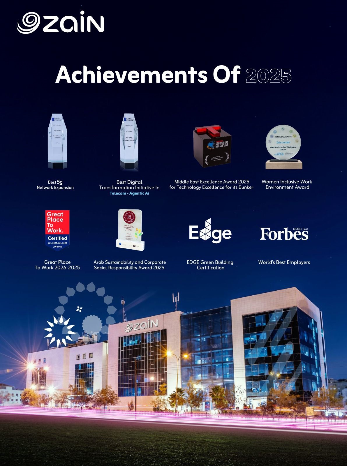 ونظراً لجهودها المتواصلة في ترسيخ التحوّل الرقمي وتوظيف تقنيات الذكاء الاصطناعي والاستثمار بأحدث ما توصّلت إليه التكنولوجيا من حلول قائمة على الذكاء الاصطناعي لخدمة المجتمع وتعزيز تجربة زبائنها وإثرائها، حصدت شركة زين الأردن جائزة "أفضل مبادرة للتحوّل الرقمي في قِطاع الاتصالات" لعام 2025 عن مُبادرتها المُبتكرة (Agentic AI) وذلك ضمن جوائز Global Economics Awards التي منحتها مجلة Global Economics البريطانية المتخصصة في الشؤون الاقتصادية العالمية، حيث أسهمت مبادرة (Agentic AI) في تقليص مدة معالجة الطلبات الداخلية بنسبة 80% ورفع رضا المستخدمين الداخليين إلى 95% وتوفير أكثر من 1000 ساعة عمل سنوياً.